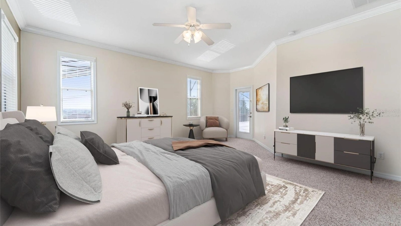 The private primary suite truly stole the show, boasting a large walk-in closet, dual vanities, a soaking tub, a walk-in shower, and a cozy sitting area that opens to the patio — a true retreat with serene natural light and calming views.