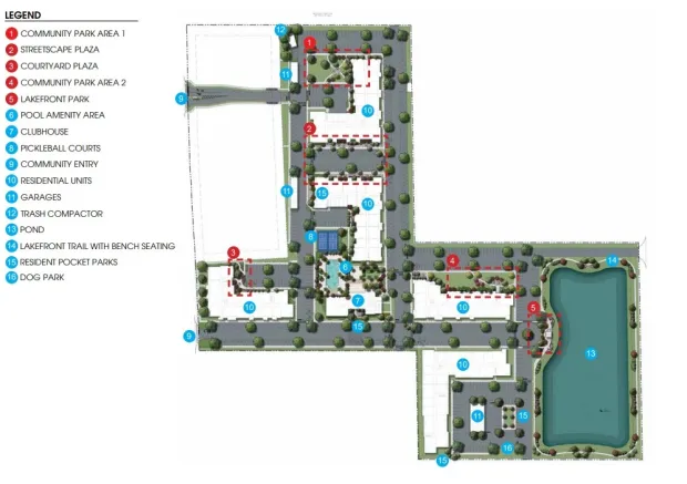 Amenities will include a clubhouse, pool, pocket parks, fitness center, simulator room, and co-working space.