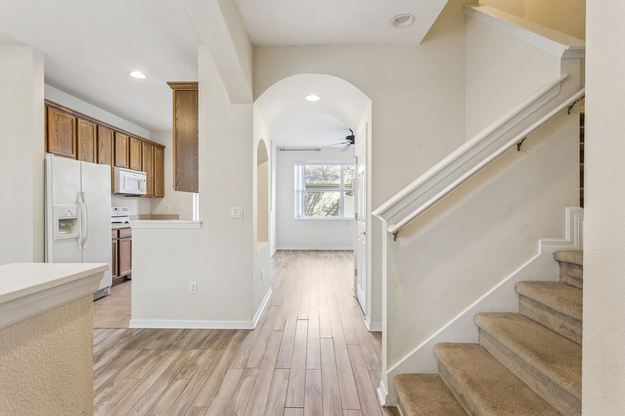 Inside, the home feels warm and welcoming with an expansive, light-filled living area on the main floor. The interior features durable laminate and tile flooring throughout, offering a clean, well-maintained “canvas” ready for your personal touch. Upstairs, you’ll find a dual-suite layout featuring two generous bedrooms, each with its own private bathroom—ideal for privacy and convenience.
