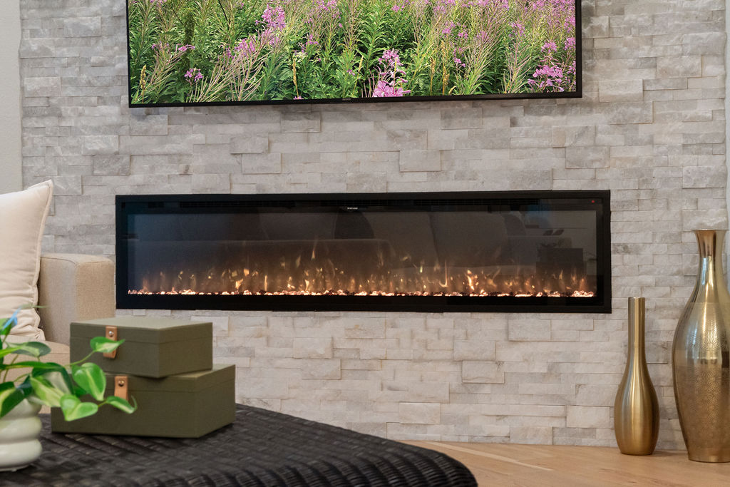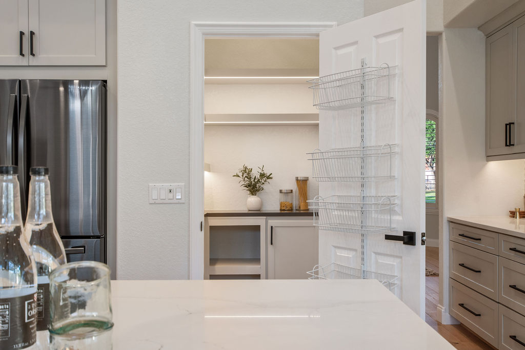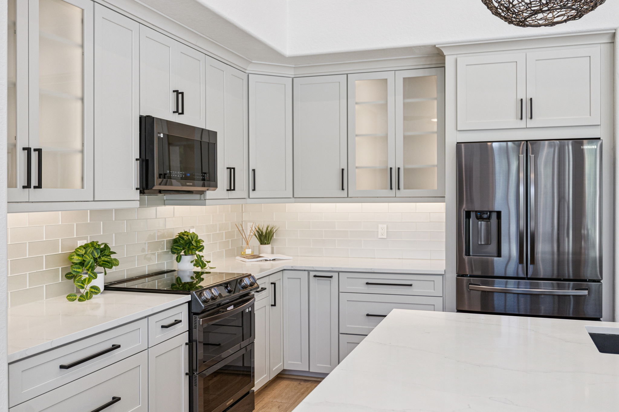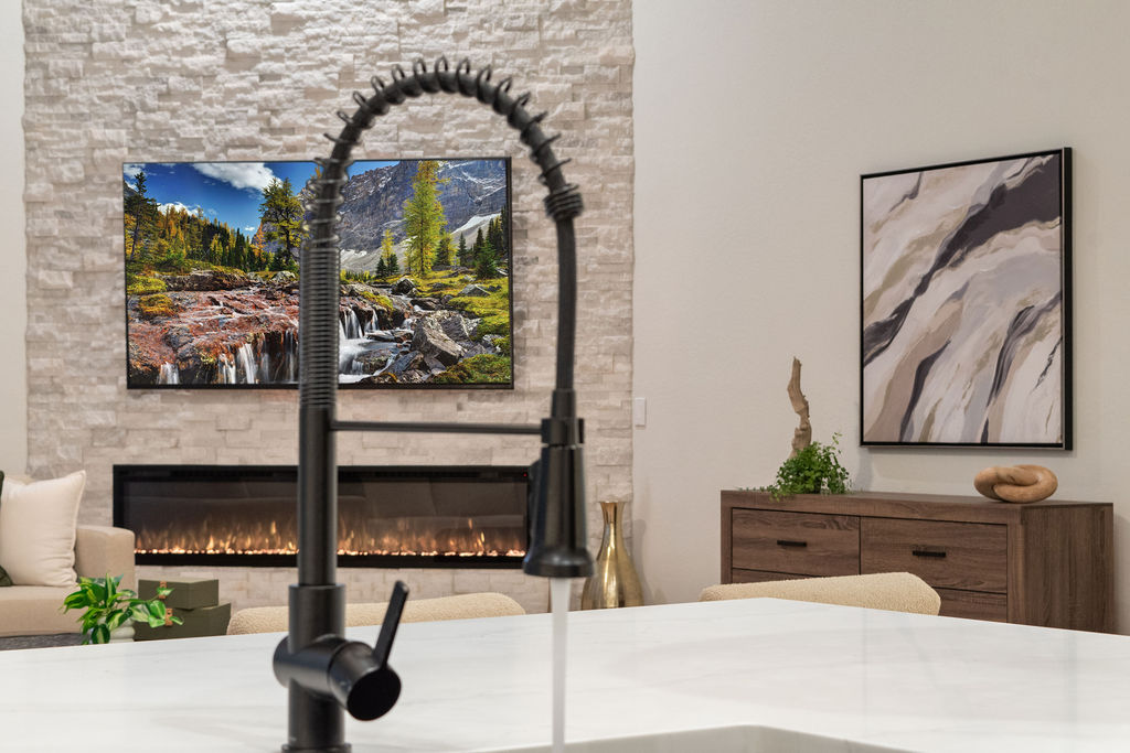 The great room anchors the home with a floor-to-ceiling stacked stone electric fireplace with thermostatic heat control and seamless access to the outdoors through oversized sliders. Smart dimmable LED warm strip lighting runs throughout — and at dusk, with the fireplace glowing, the pool lit, and the strips dialed low, this home comes alive in a way that has to be experienced. The chef's kitchen delivers at every level: solid Maple cabinetry, quartz countertops, designer backsplash, Samsung Stainless appliances with induction range and double oven, and a walk-in butler's pantry with quartz counters. A casual dining space off the kitchen overlooks the pool and patio.
