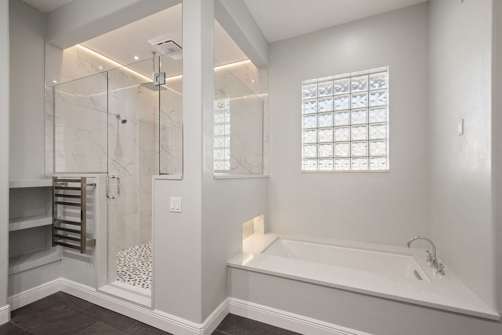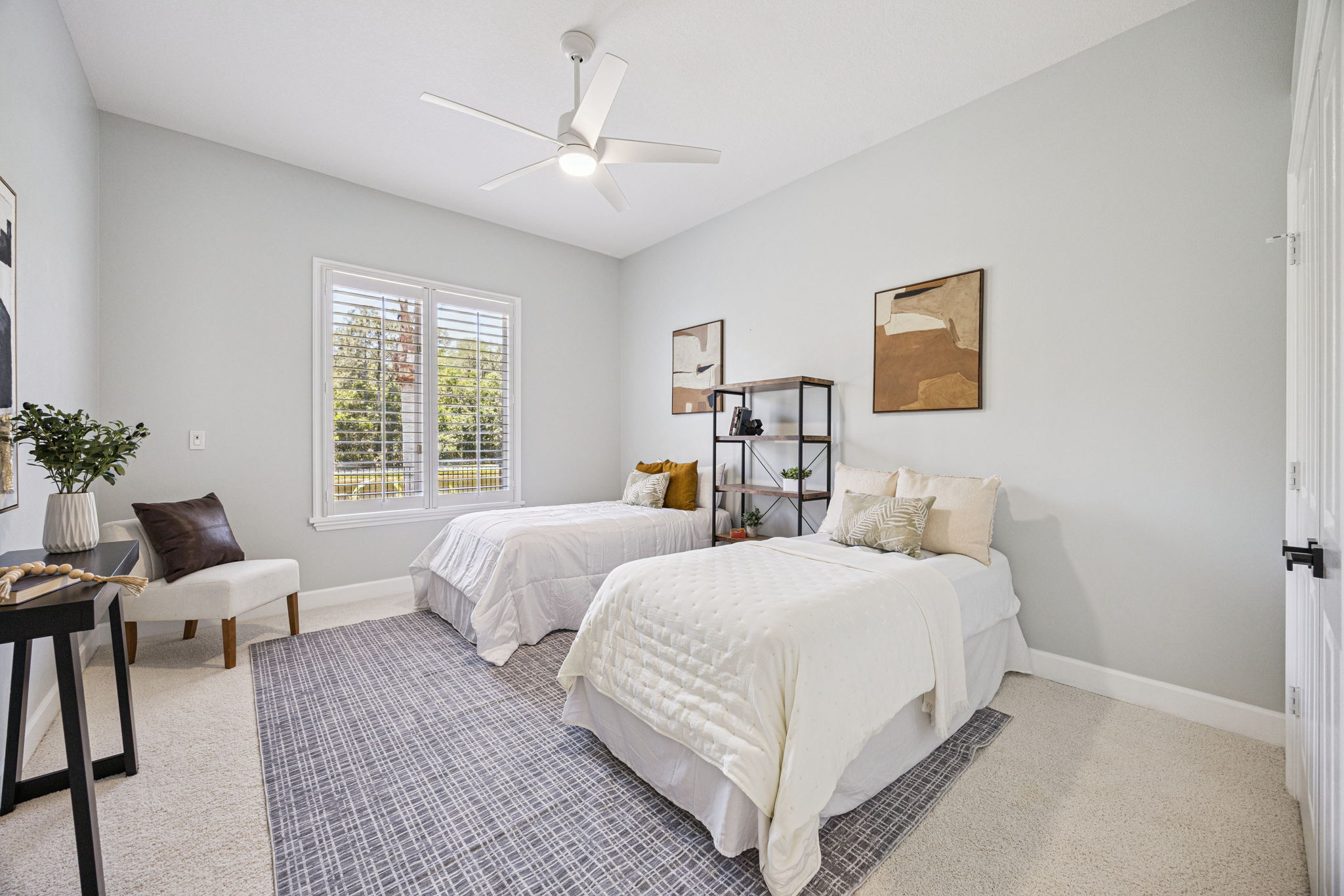 The primary suite is its own statement — split for true privacy, featuring a custom dark wood shiplap tray ceiling with accent lighting, plantation shutters, and a spa-like bath finished in quartz with solid Oak and Birch vanities. Every bedroom has brand new carpet and solid Maple custom built-out closets. Every bathroom, laundry room, and shower niche carries quartz surfaces, tiled accents, and custom lighting throughout. This home was done right, and it shows in every corner.