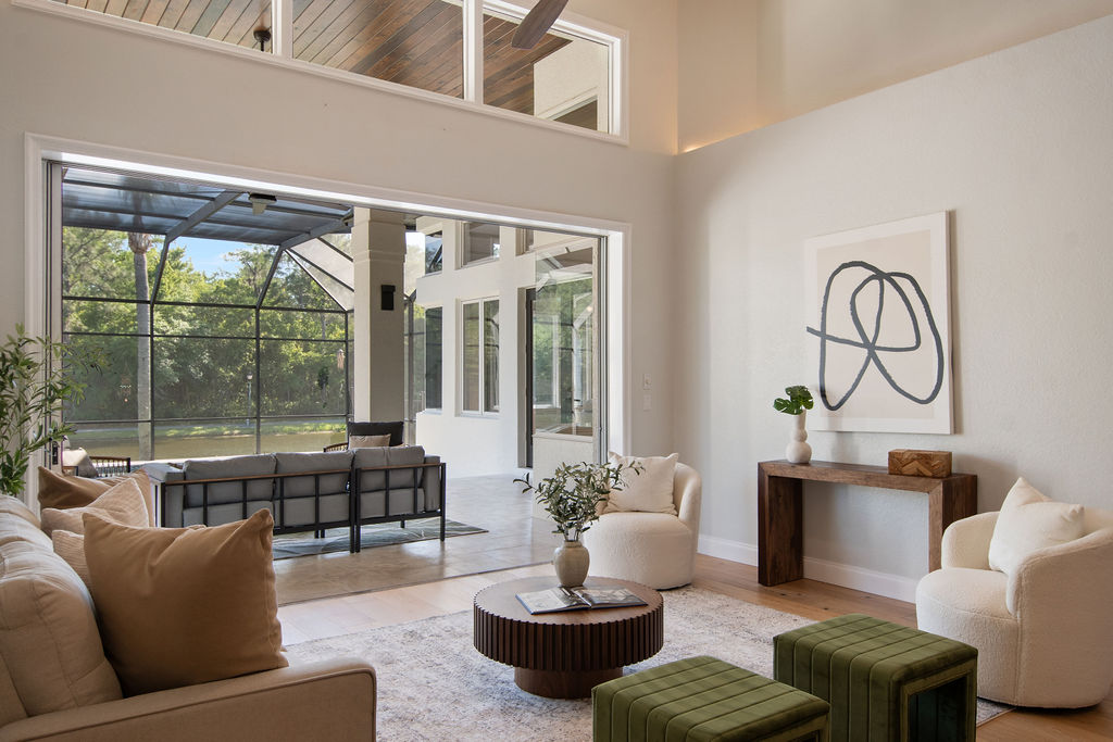 Inside, over 3,000 square feet of reimagined living space flows across a single level beneath a solid tile roof — meaning lower insurance costs, superior storm protection, and decades of worry-free ownership. Soaring 14-foot ceilings and wide-plank extra-long French Oak tongue and groove flooring — sandable, stainable, and backed by a double lifetime warranty — set the tone from the moment you step through the massive 8-foot double doors. That first sightline across the open great room, past walls of windows, straight to the water, stops you in your tracks every time.