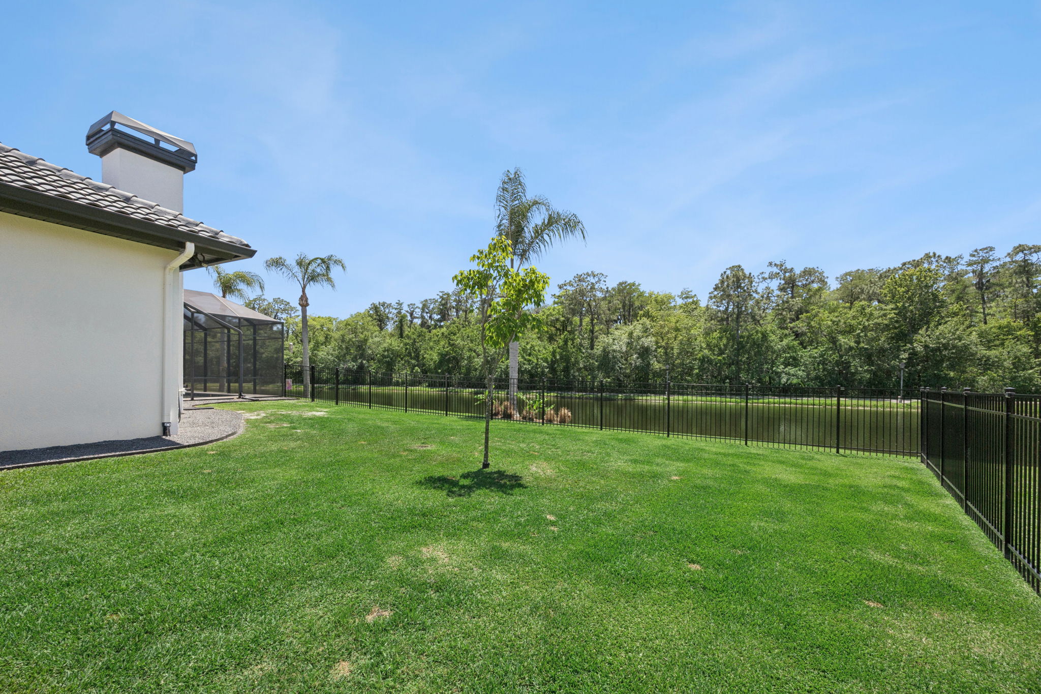 Step outside to a backyard built for Florida living at its finest. The centerpiece is a 10-foot deep, 35,000-gallon saltwater pool finished in Pebble Tec Ocean Blue Pebble Sheen with sparkling abalone and mother of pearl shell blend — lifetime warranty. New Pentair pump and pool light, waterfall feature, textured marble pavers at the pool surround, back patio, and front entry, all beneath a walnut stained tongue and groove covered lanai. Fully fenced oversized rear yard, outdoor cooking space, and water views that never get old.